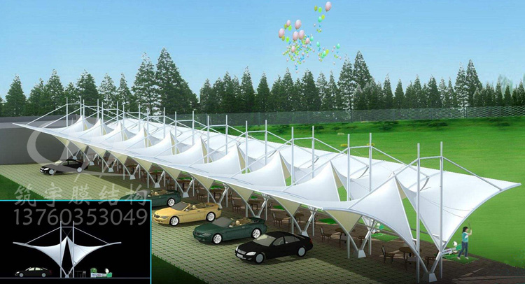 膜結構作為一種新型材料,因為其自重輕、施工快、美觀等原因大量應用于現代建筑,膜結構車棚的興起,實現了車棚的實用性,又兼顧了美觀性。
